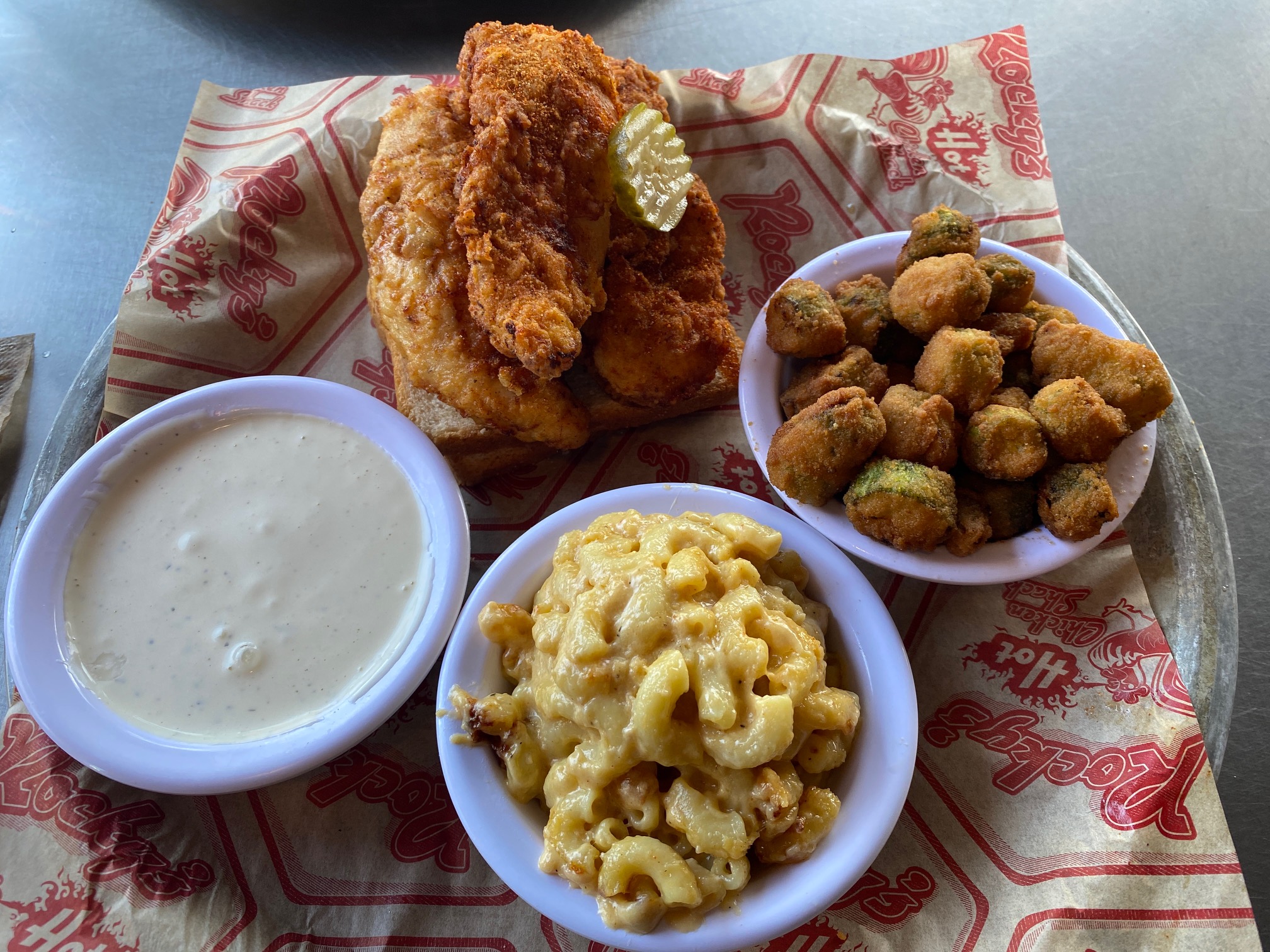 Rocky’s Hot Chicken Shack – Rocky’s in West Asheville is a popular locally owned spot, so be sure to give yourself some time to order at their counter and receive your food. They are known for paying homage to “Nashville style” chicken and for their sides made from scratch daily. I order the 3 fried tenders with fried okra and mac n’ cheese as sides. The chicken was nicely breaded and tender, and the okra was crisped to perfection.