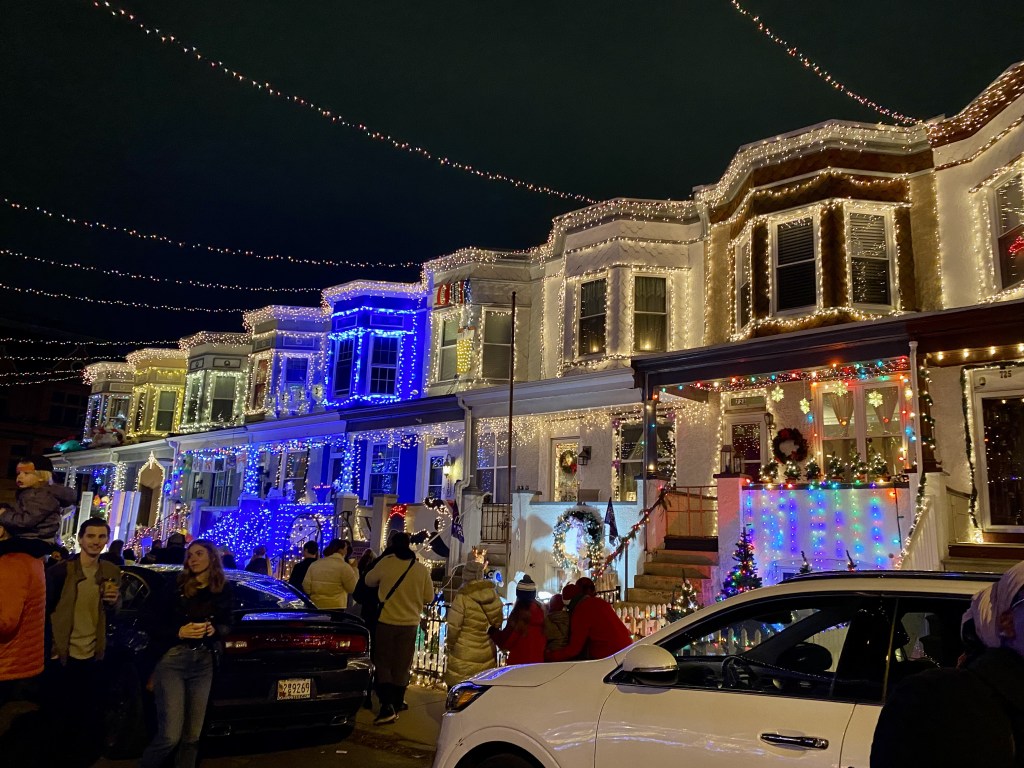 On West 34th Street in Baltimore, there is a block of row homes that decorate enthusiastically for the Christmas season, an event that has been dubbed the “Miracle on 34th Street”. A few homes have themed decorations like the Hanukkah house, flamingo house, Ocean City house, and the hubcap Christmas tree. Mark and I spent a festive evening viewing the all-out light displays. The Miracle on 34th Street runs from the first Saturday after Thanksgiving to New Year’s Day.