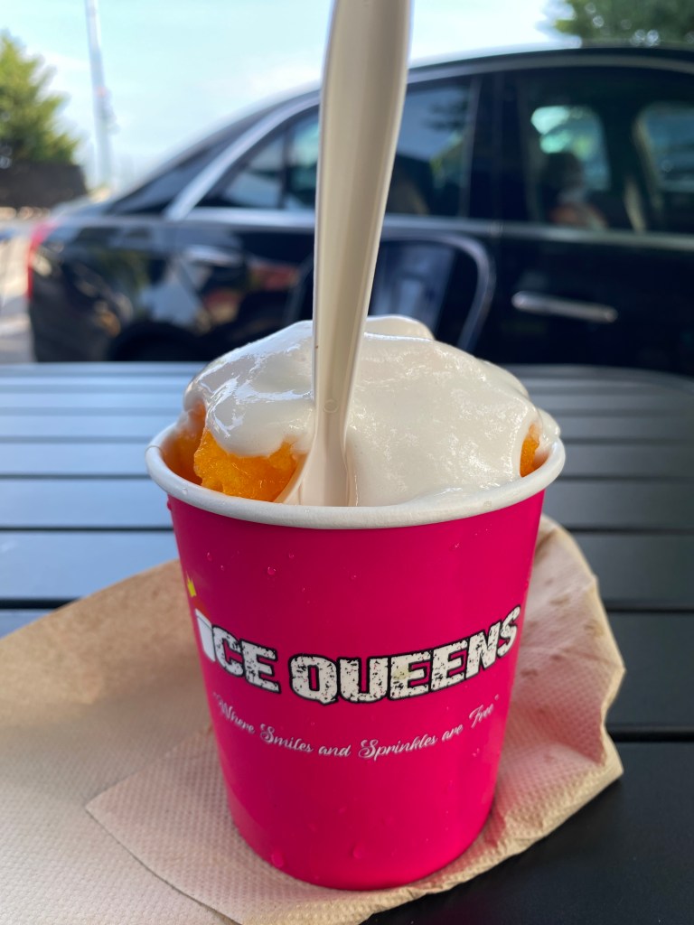 A snowball is an iconic Maryland dessert. It consists of chopped ice covered with a few pumps of flavor. The most traditional flavor (and my favorite!) is egg custard with marshmallow topping, but alternative flavors are available. Ice Queens is one of the most popular snowball shops in Baltimore with a cool colorful vibe and outdoor seating.