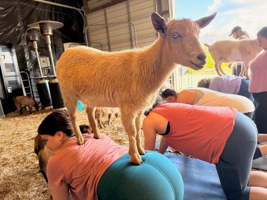 On Sunday morning we made our way thirty minutes outside the city to RVA Goat Yoga at Pactamere Farm to partake in their Sunday goat yoga session with farm-to-table brunch. This was a simple stretching yoga session complimented by many, many goats who are trained to jump on your back during the session. They seemed to love me as they jumped on me numerous times and their hooves felt like a deep tissue massage (complete with my back being sore the next day!). I had never done goat yoga before and really enjoyed this experience. After the yoga session we had some time to take photos with the goats and then were served a farm-to-table brunch.